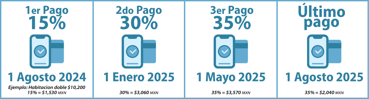 **Se aceptarán pagos del 1 hasta el 24 de cada mes. De realizarlos del 25 hasta el último día de mes, se les penalizará con un cargo del 10% del total de la habitación.